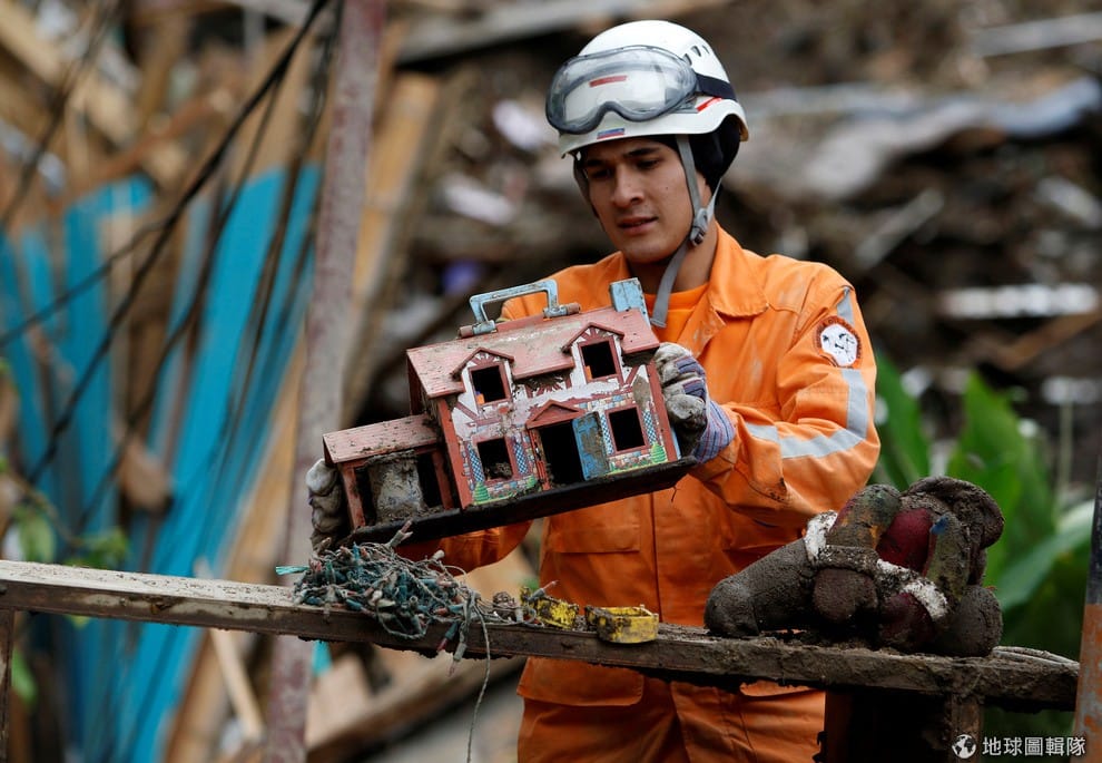 一名搜救人員從被土石流夷平的區域找到一間玩具屋。哥倫比亞因為連日的大雨導致溪水暴漲,使得中部城市馬尼薩萊斯(Manizales)發生土石流意外,造成至少 17人死亡,目前救援行動仍在進行中。
