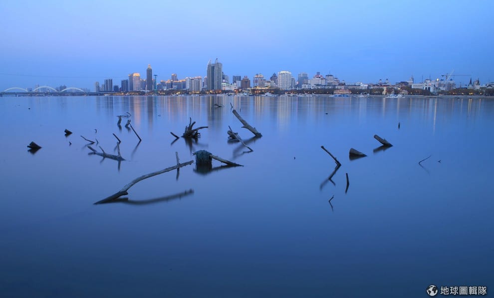 在黑龍江省哈爾濱市,成排的高樓映照在松花江河畔。
