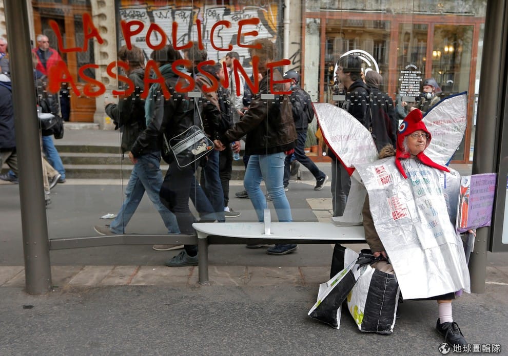 在法國第一輪總統大選前夕,一名剛抗議完的示威者坐在公車亭休息,在她後方的窗戶寫著「警察殺人」。