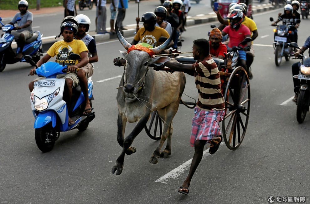 一隻裝上推車的公牛在斯里蘭卡首都科倫坡(Colombo)的街頭上奔跑。斯里蘭卡的僧伽羅人、印度教教徒、坦米爾人(Tamil)正在慶祝新年的來臨,其中「牛車賽跑」是他們在新年時的傳統活動。