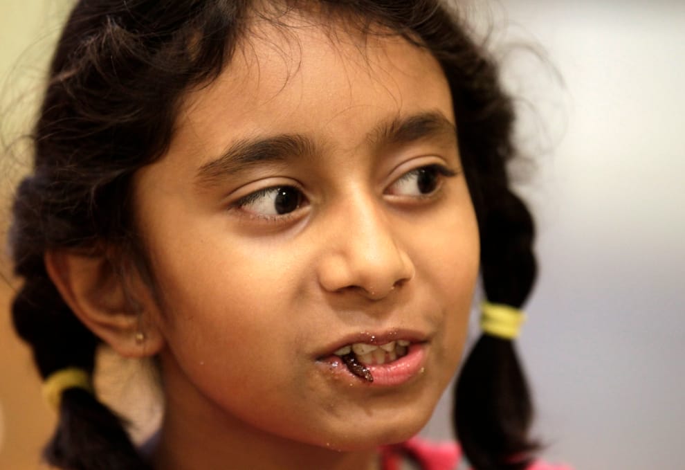 2011年11月11日,一名小女孩正在美國紐奧良的奧杜邦蝴蝶花園和昆蟲館(Audubon Butterfly Garden and Insectarium)享用蠟蟲做成的點心。