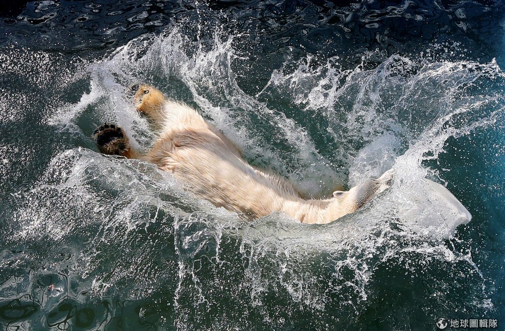 7歲大的北極熊奧羅拉(Aurora)在嚴冬過後,開心地跳入動物園設置的游泳池玩耍。
