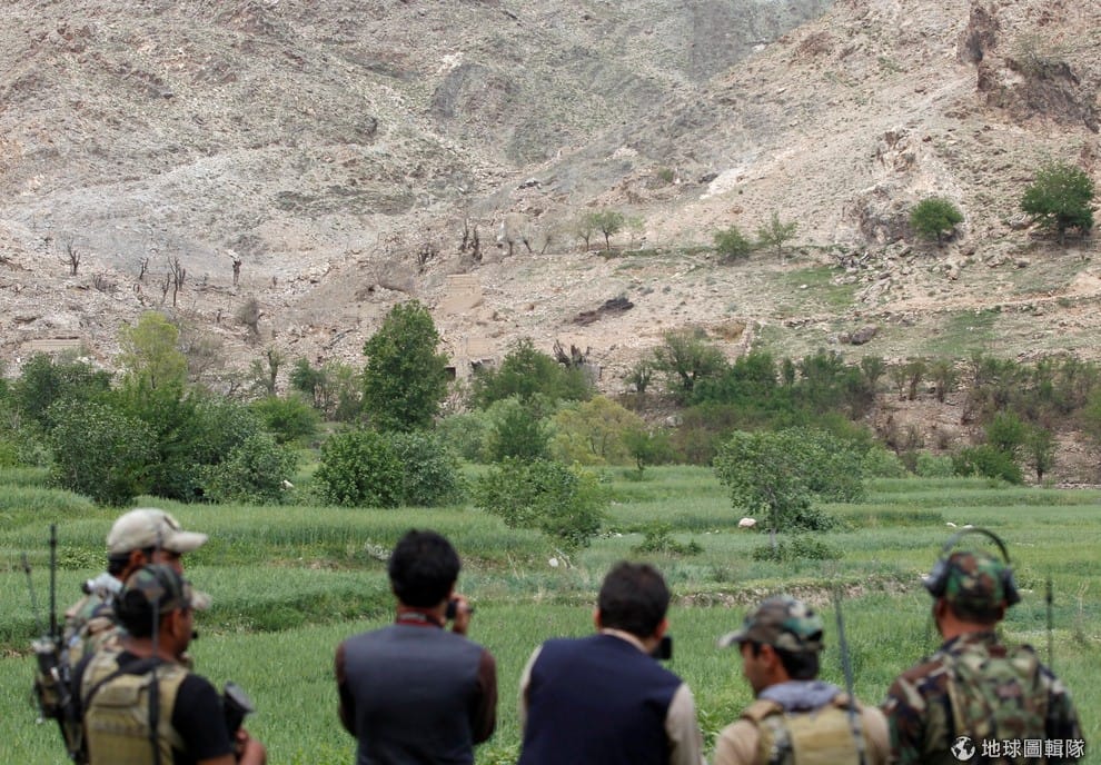 阿富汗特殊部隊的成員觀測著美國在 14號發射的「炸彈之母」所擊中的地點。