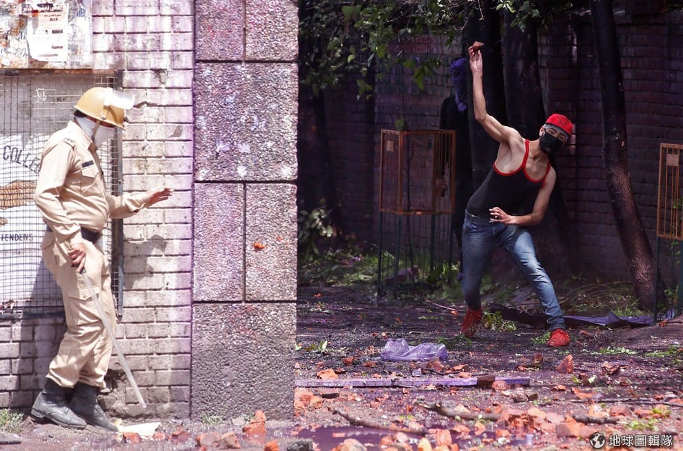 在查謨喀什米爾邦(Jammu and Kashmir)的斯利那加(Srinagar),一名喀什米爾的學生朝印度警察扔擲石頭。