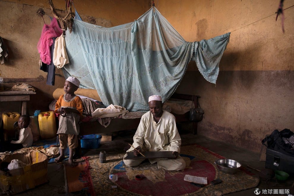 在中非共和國首都班基(Bangui)難民營,一名男子低頭抄寫著《可蘭經》經文。
