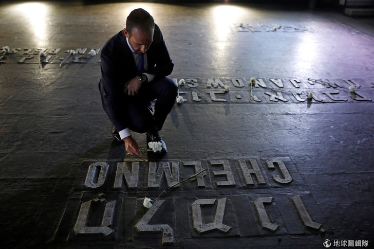 24號是以色列的大屠殺紀念日(Holocaust Remembrance Day),一名男子來到以色列猶太大屠殺紀念館,並在刻有前集中營名字的地板上擺放鮮花。
