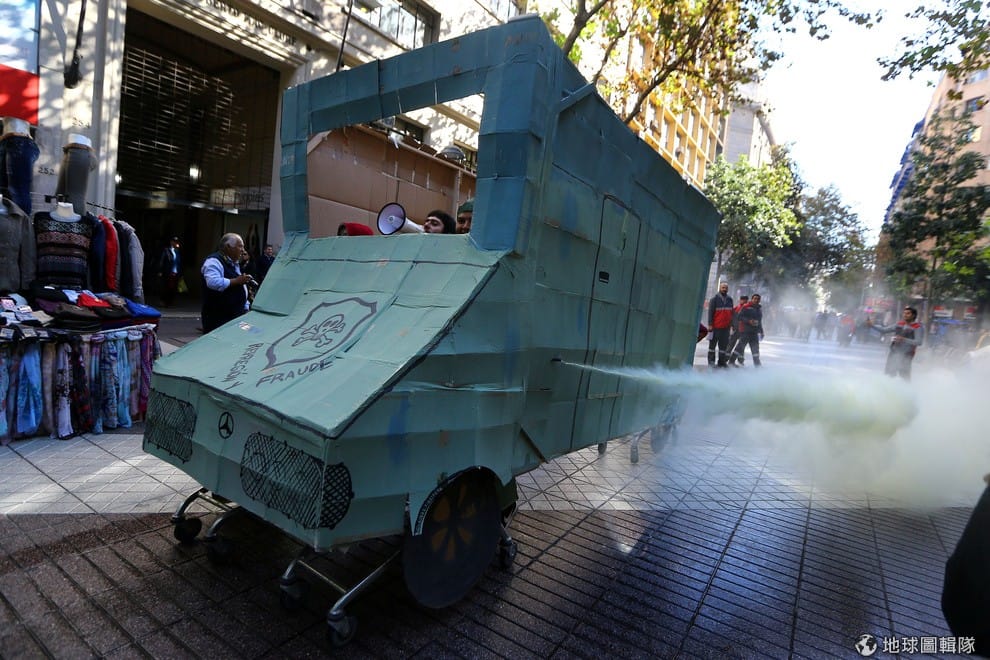 在智利首都聖地亞哥(Santiago),一名示威者仿製了鎮暴警察用的噴水車,上街希望政府重視國內的教育體制改革,同時對智利警界近期爆發的、金額達數百萬的詐欺案表示不滿。