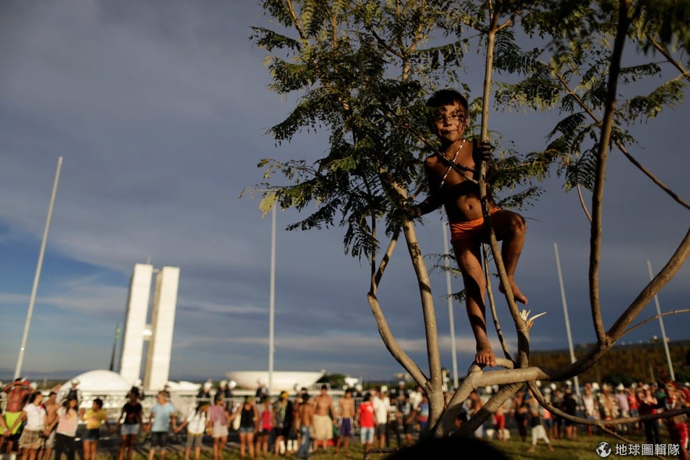 一名原住民男孩爬上小樹看向鏡頭,在他後方的是正在伸張原住民權利的示威人潮。