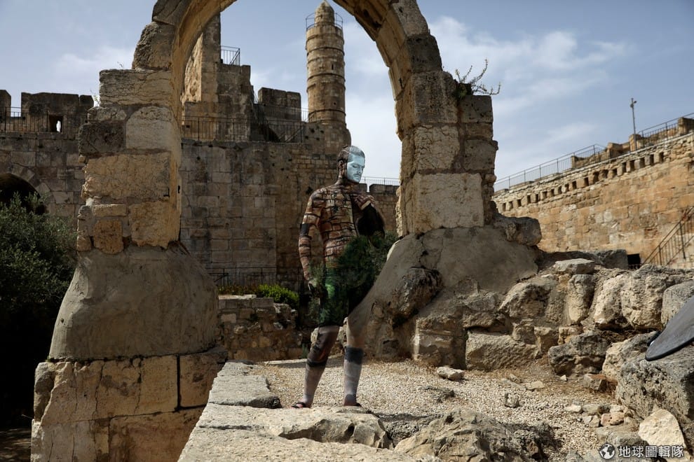 在耶路撒冷老城區大衛塔,一名男模全身塗上油彩,正在為藝術家Avi Ram from Airbrush Hero拍攝新一年的日曆。