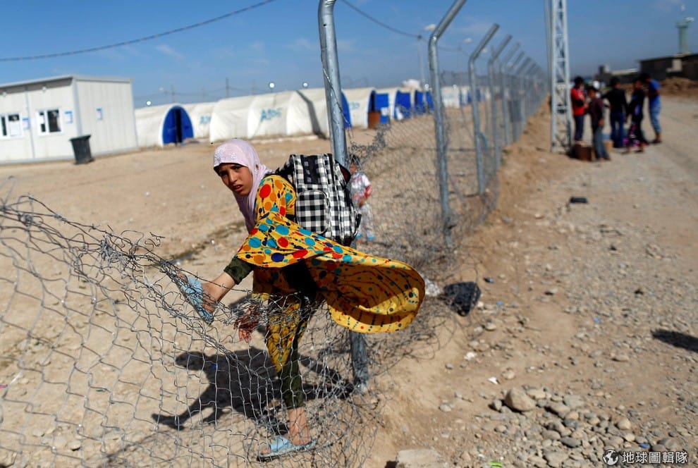 在摩蘇爾城(Mosul)南部的哈馬姆-阿利爾鎮(Hammam al-Alil)難民營,一名流離失所的伊拉克女孩繞過圍籬進入難民營。