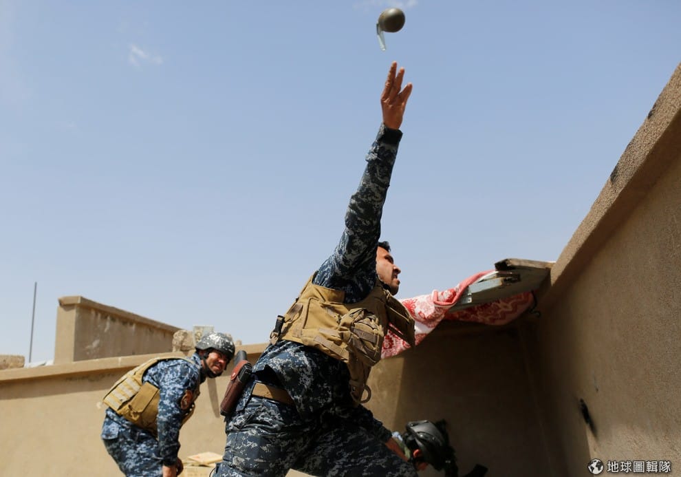 伊拉克聯軍在西摩蘇爾城(Mosul)與伊斯蘭國(IS)的戰鬥正如火如荼地進行著,攝影師拍下一名伊拉克聯邦警察正朝敵方扔出一枚手榴彈。