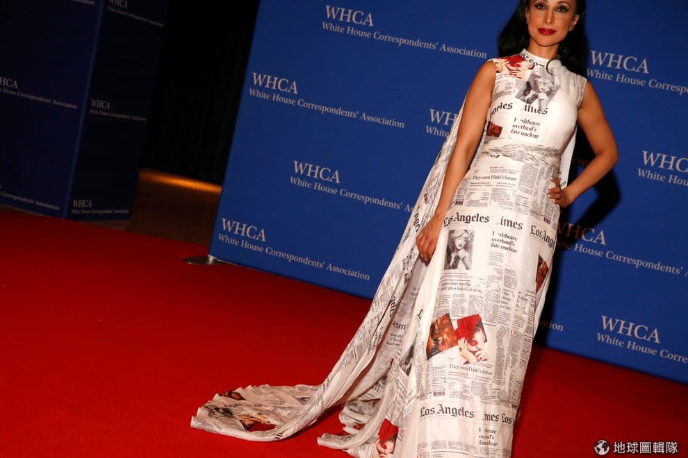 《福斯新聞》的客座來賓蕾德克里芙醫生(Dr. Nina Radcliff)身穿以新聞報紙為主題的洋裝,出席白宮一年一度的白宮記者協會晚宴。