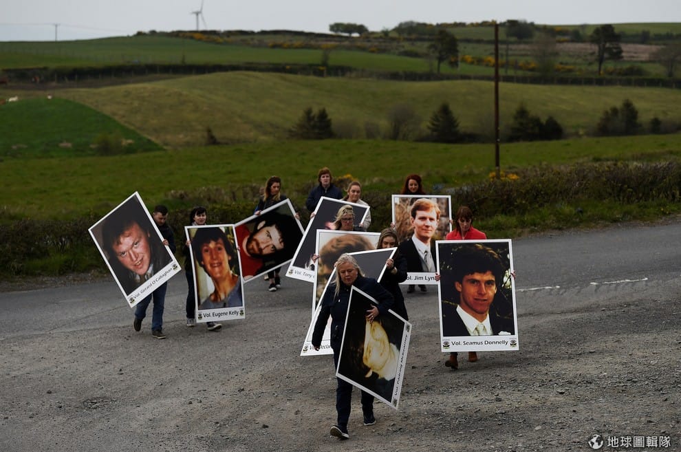 在北愛爾蘭政黨新芬黨(Sinn Féin,中譯為「我們」)的遊行上,人們拿著 8名愛爾蘭共和軍(Irish Republican Army, IRA)成員及 1名拉高爾(Loughgall)村民的照片,紀念他們離世至今已經 30周年。