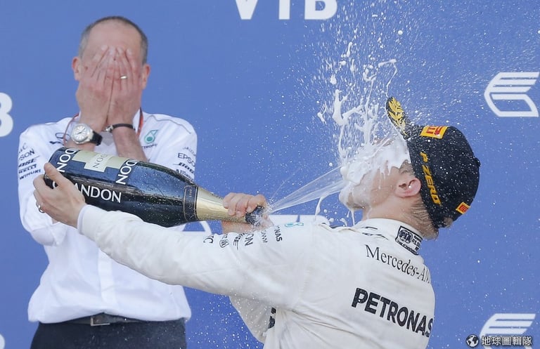 在一級方程式賽車錦標賽(Formula One, F1)的賽程俄羅斯大獎賽(Russian Grand Prix)中,拔得頭籌的芬蘭籍賽車好手鮑達斯(Valtteri Bottas)開心地在講台上打開香檳慶祝。