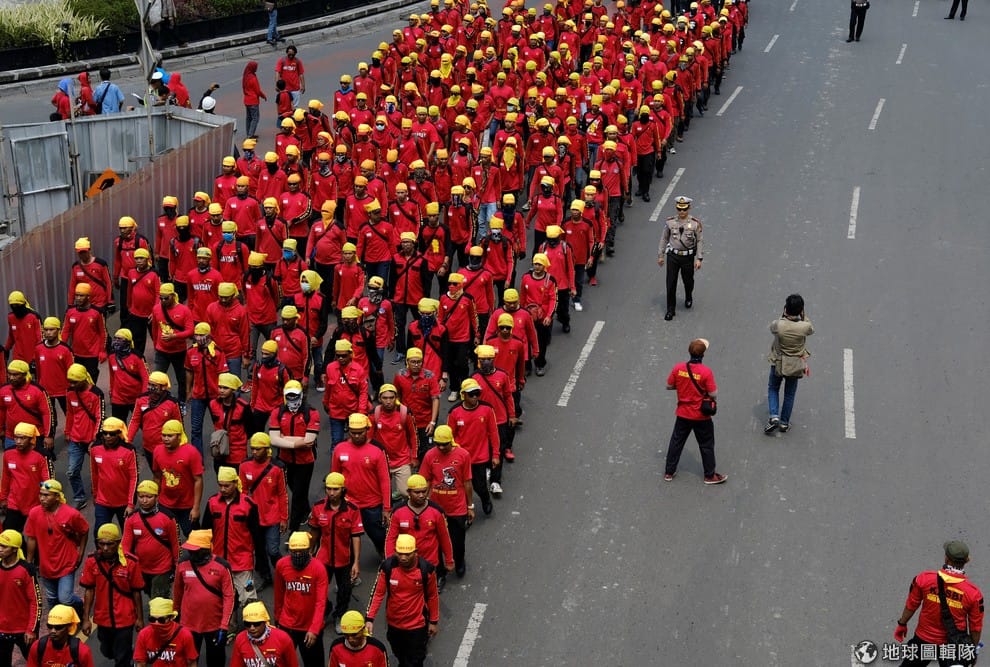 身穿紅衣的印尼警察也在這天走上雅加達街頭。印尼各地都有人上街呼籲政府重視最低薪資、勞力派遣等勞動議題。照片攝於 2017年5月1日。