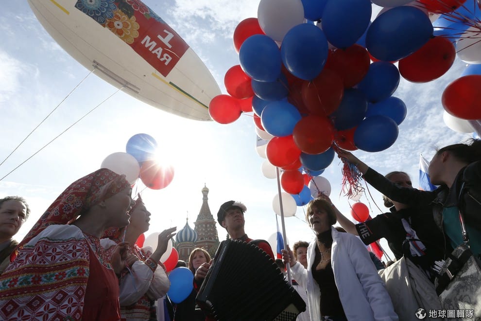 人們拿著象徵俄國的紅藍白三色氣球,一同在莫斯科(Moscow)的紅場慶祝勞動節,自從前蘇聯領袖列寧(Vladimir Lenin)推翻羅曼諾夫王朝後,便把 5月1日設為官方節日。而紅場的慶祝活動是 2014年由俄國政府復興,藉此凝聚人們的國族意識。照片攝於 2017年5月1日。