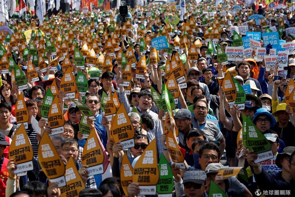 路透社南韓人民則是在全國民主勞動組合總聯盟(KCTU,전국민주노동조합총연맹)的號召下走上首爾街頭,爭取改善最低工資及臨時工的工作條件。照片攝於 2017年5月1日。