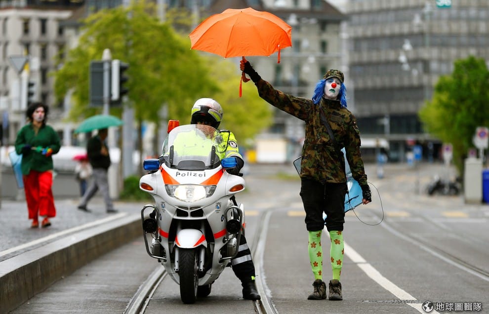 路透社在瑞士蘇黎世街頭,一名打扮成小丑的示威者替坐在摩托車上的警察打傘,形成一幅奇妙的景致。照片攝於 2017年5月1日。