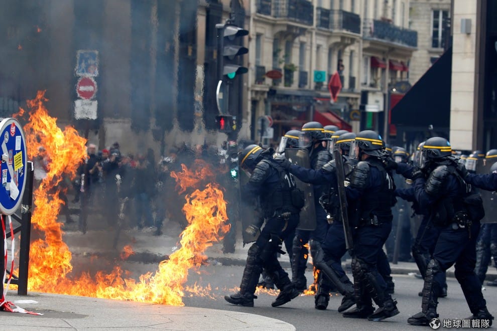 路透社但在巴黎街頭的抗議中,人們不時朝街道投擲燃燒彈,並在示威過程中導致 6名警察受到燃燒彈波及受傷。照片攝於 2017年5月1日。