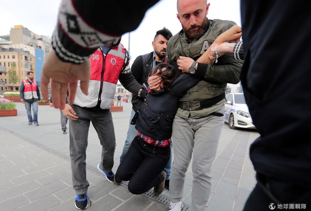 土耳其城市伊斯坦堡則禁止人們在塔克西姆廣場(Taksim Square)集會遊行,許多土耳其人像圖中的示威者一樣,本來試圖闖入管制區抗議,卻遭到便衣鎮暴警察逮捕拘留。照片攝於 2017年5月1日。