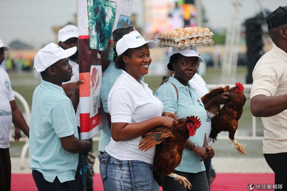路透社在奈及利亞拉哥斯,為農業部門工作的示威者頭頂著雞蛋、帶著公雞走上街頭抗議。照片攝於 2017年5月1日。