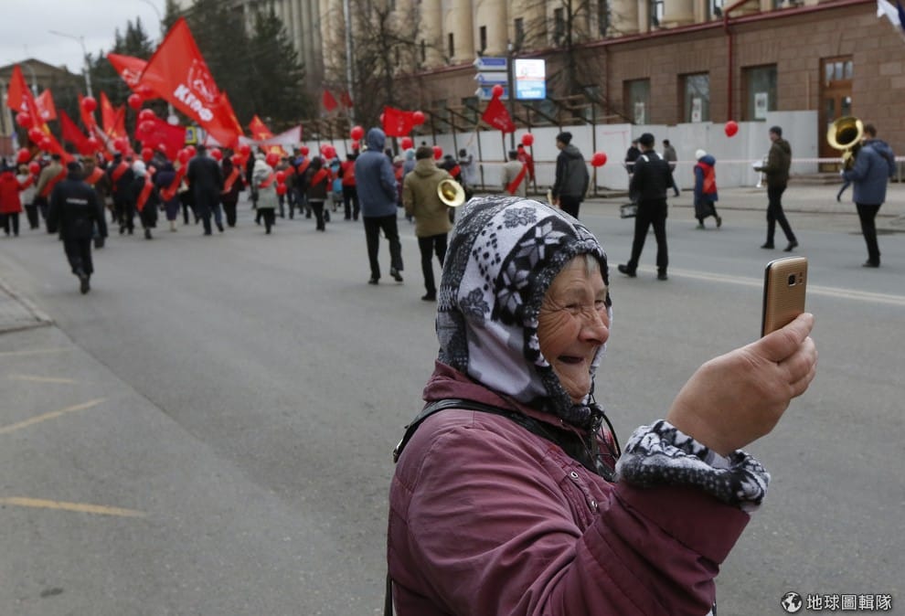 路透社除了慶祝勞動節,俄國共產黨也帶著紅旗走上街頭,要彰顯傳統勞動節的真正精神。在俄國城市克拉斯諾亞爾斯克(Krasnoyarsk),一名參加遊行的婦人開心地和共產黨遊行隊伍自拍。照片攝於 2017年5月1日。