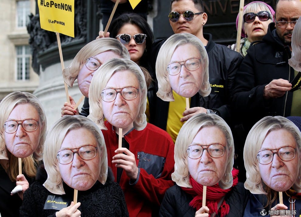 一年一度的勞動節自然沒有讓法國人錯過。人們手著拿著面具是極右派民族陣線黨創始人尚馬利雷朋(Jean-Marie Le Pen)的臉加上他的女兒勒龐(Marine Le Pen)的髮型。勒龐同時也是 2017年的法國總統參選人。照片攝於 2017年5月1日。