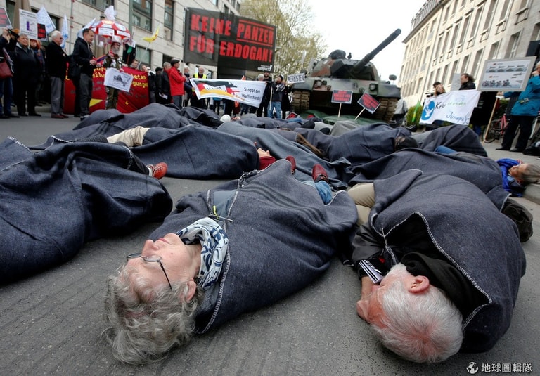 在德國軍火公司萊茵金屬(Rheinmetall)集團的年度股東大會上,抗議民眾躺在已經退役的坦克前,反對萊茵金屬公司打算出口坦克到土耳其的計畫,一旁的抗議標語寫著「不要送坦克給埃爾多安(註:土耳其總統Recep Tayyip Erdogan)」。