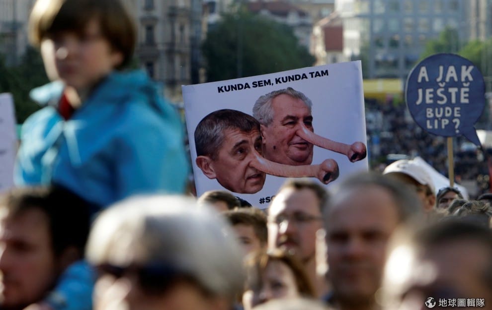 成千上萬的民眾在捷克各大城市抗議,要求捷克總統澤曼(Milos Zeman,右)盡快開除財政部長巴比斯(Andrej Babis,左),兩人的頭像也被畫成說謊的長鼻子小木偶。家財萬貫的巴比斯涉嫌逃稅遭到人民唾棄,但至今他仍否認有任何不法,拒絕下台。