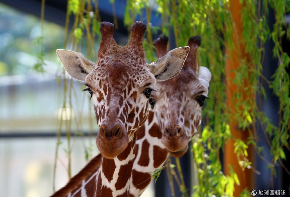 在維也納美泉宮動物園內,兩隻長頸鹿一前一後看像鏡頭,錯位後就像一隻長了兩顆頭的長頸鹿一樣。