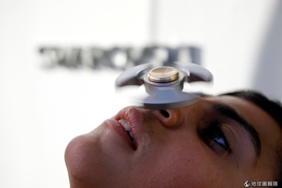 在指尖陀螺(spinner)大賽上,一名參賽者想辦法用它玩出新花樣。近日,指尖陀螺開始在全球流行起來,這是一種三葉形的小玩具,使用者只要用食指和拇指按住中央的控制鈕,指尖陀螺的三片扇葉就會開始高速旋轉,給人帶來一種難得的紓壓感。