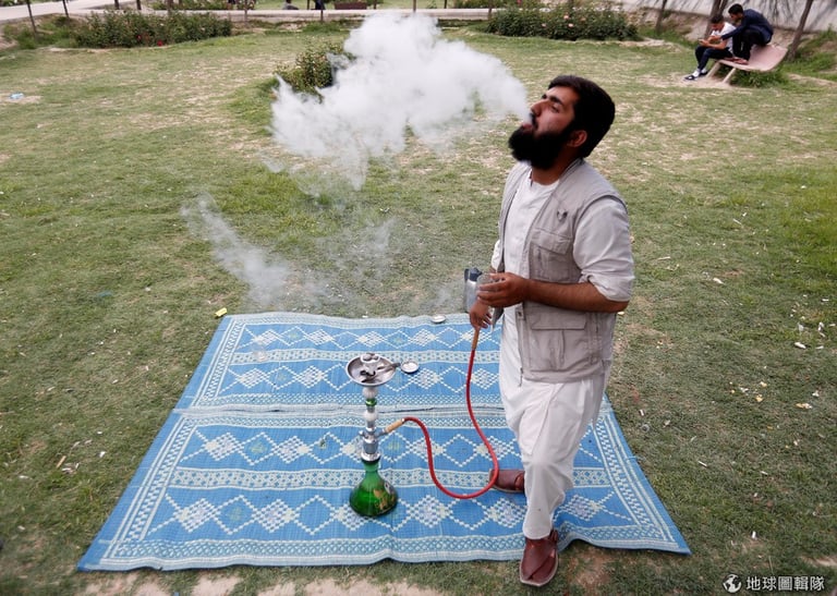 一名男子在首都喀布爾(Kabul)吞雲吐霧,體驗抽水煙的快感。