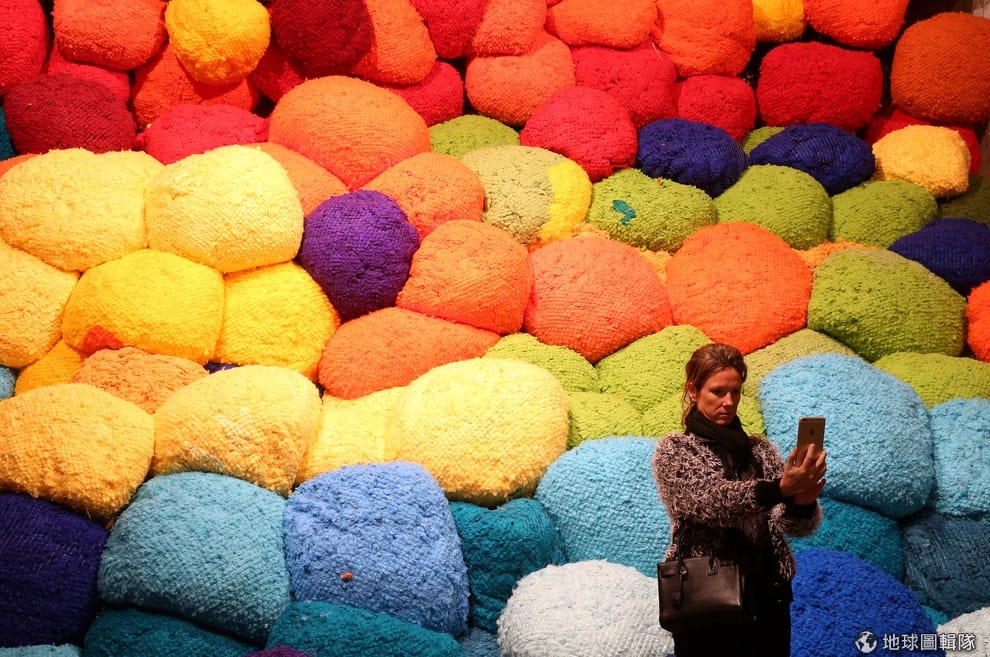 一名參加威尼斯雙年展的遊客,拿起手機和美國藝術家希克斯(Sheila Hicks) 的作品《超越彩色土地》自拍。