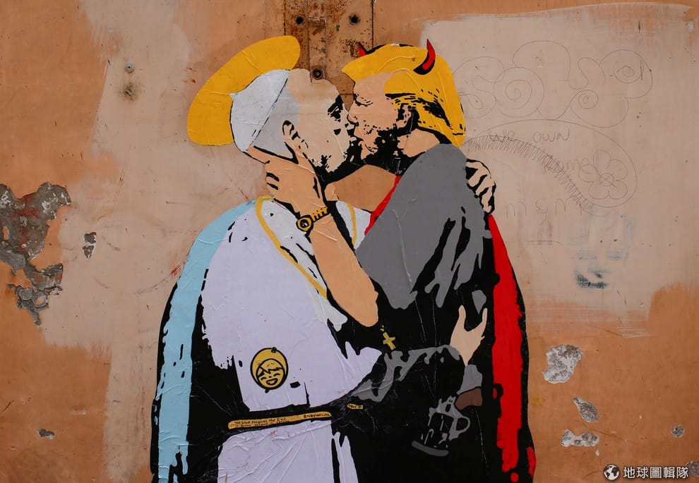 在羅馬街頭,一幅美國總統川普(Donald Trump)擁吻羅馬天主教宗方濟各(Pope Francis)的壁畫吸引路人駐足。