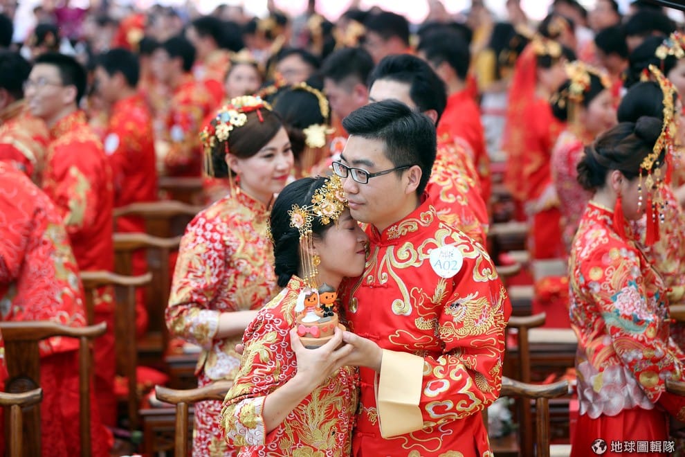 在位於杭州的阿里巴巴總部,新人們穿上鳳冠霞披舉行集團婚禮,和公司一起分享結婚的喜悅。