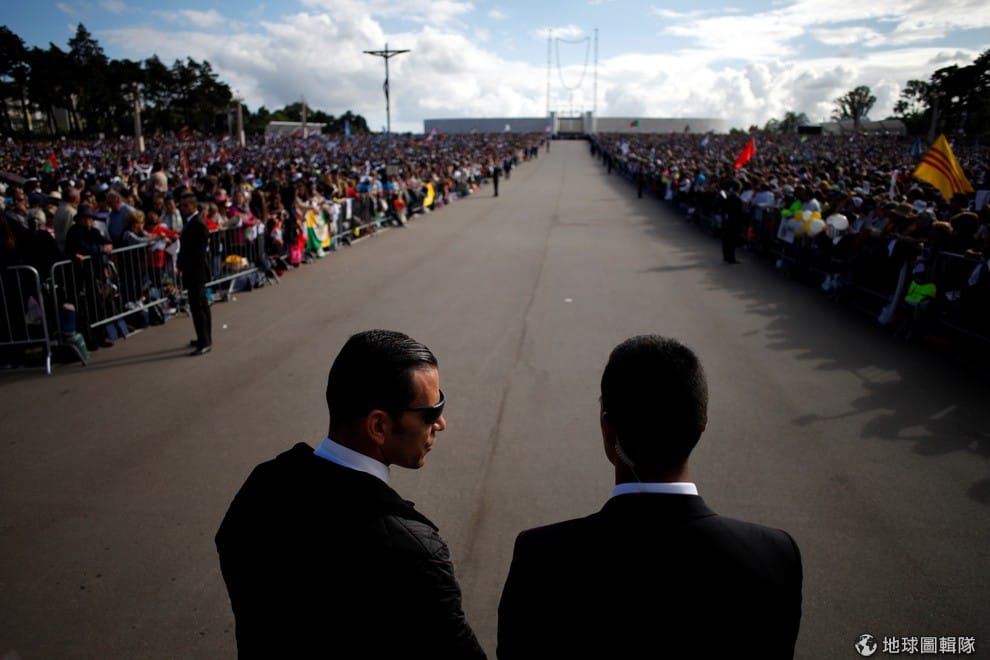 在位於葡萄牙中部的法蒂瑪聖母朝聖地,兩名身穿黑西裝的保全人員正在交頭接耳,準備迎接羅馬天主教宗方濟各(Pope Francis)的到來。