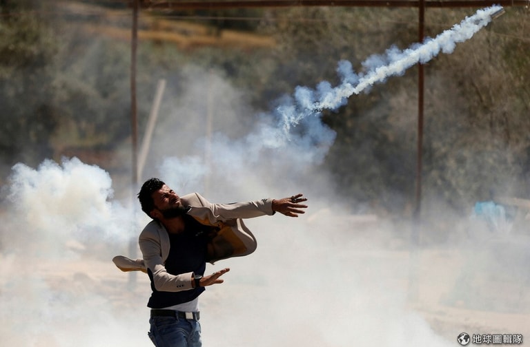 在約旦河西岸巴勒斯坦人民和以色列軍隊發生衝突的前線,一名巴勒斯坦男子將以色列軍隊發射過來的催淚瓦斯投回去。