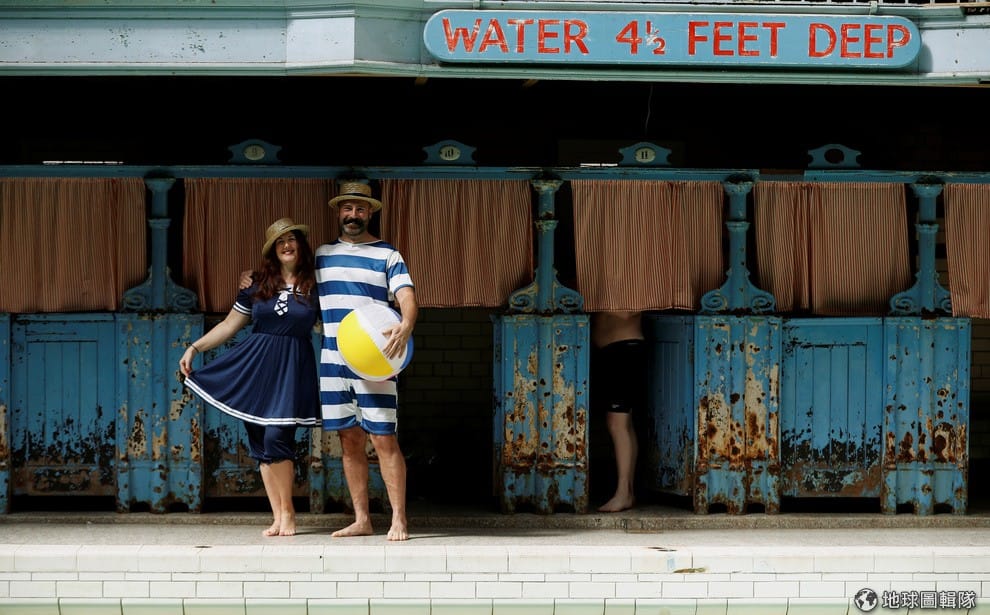 在曼徹斯特(Manchester)部分重建好的復古泳池內,民眾換上連身的復古泳裝,準備下水體驗過去人們如何戲水。