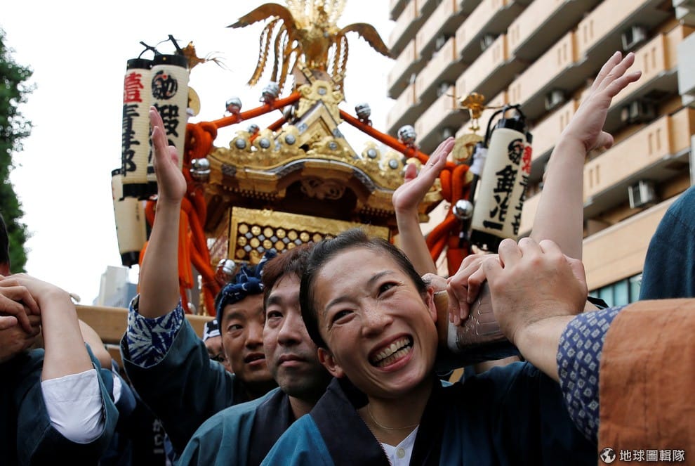 在號稱日本三大祭典之一的東京神田祭上,參加者扛著神轎繞行街頭,沿路受到民眾的歡迎與祝福。