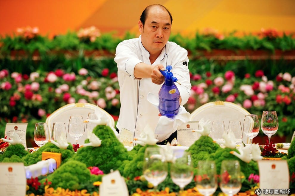 在「一帶一路國際合作高峰論壇」的歡迎餐會前,服務人員忙著將桌上的花草佈置灑點水,好維持它的新鮮度。