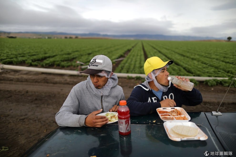 兩名來自墨西哥的移工正在享用午餐,他們的背後是位於加州整片的蘿蔓萵苣田。