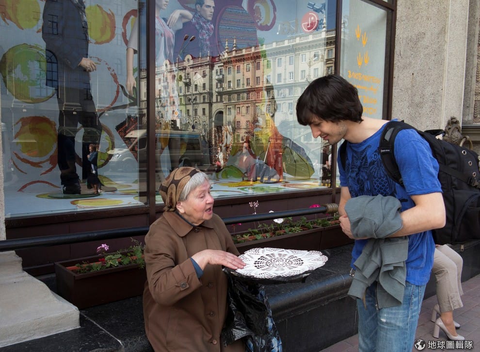 一名婦人坐在首都明斯克(Minsk)一間百貨公司的門口,向路人兜售自己編織而成的蕾絲餐墊。
