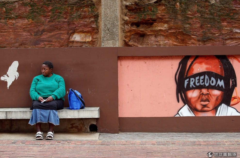 一名女子坐在一幅描繪自由遮住眼睛的壁畫旁,與此同時,位於約翰尼斯堡(Johannesburg)的憲法法庭外,群聚大批要總統祖瑪(Jacob Zuma)下台的民眾,他們認為祖瑪和他的同黨涉嫌貪汙,已經危及到了國家的根本。