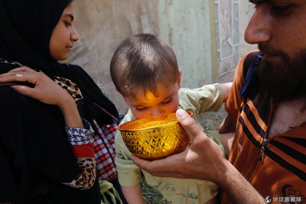 一名小男孩喝著金碗裡的水,他剛剛和家人從伊拉克軍隊和恐怖組織伊斯蘭國(IS)對峙的摩蘇爾城(Mosul)前線逃出來。