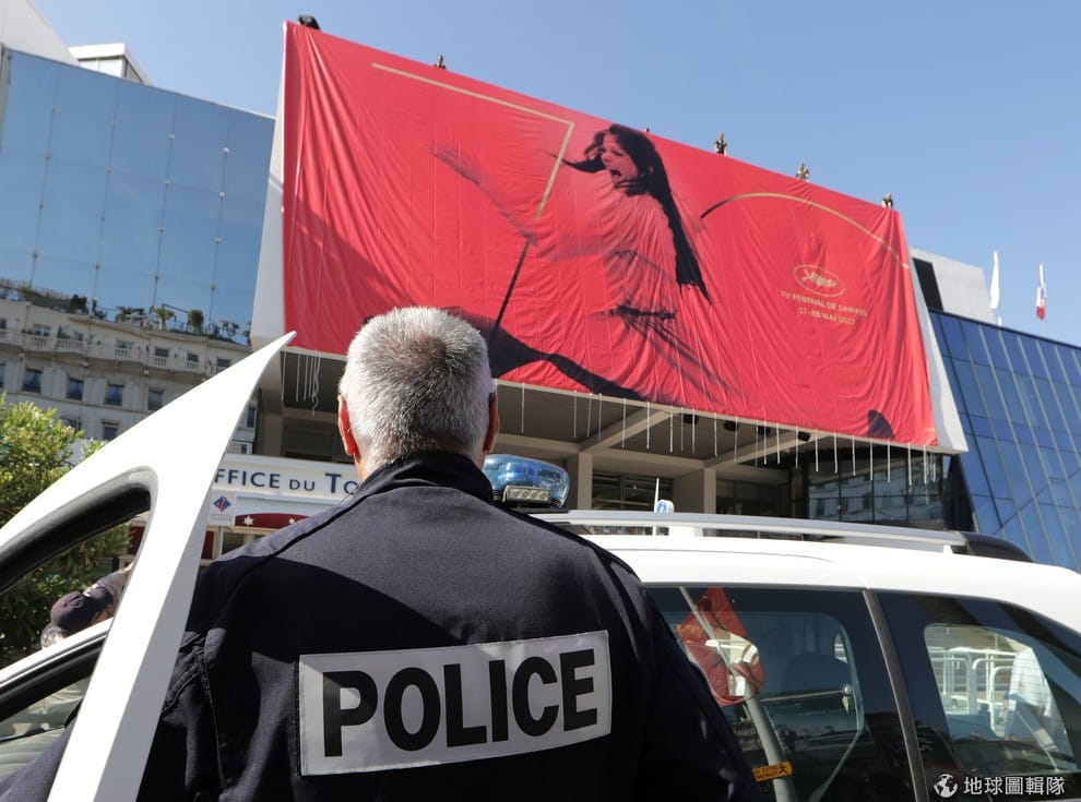 在即將舉辦第 70屆坎城影展的會場,一名警察看著印有義大利女演員卡蒂納(Claudia Cardinale)的官方海報,被貼在架起來的特殊看板上。