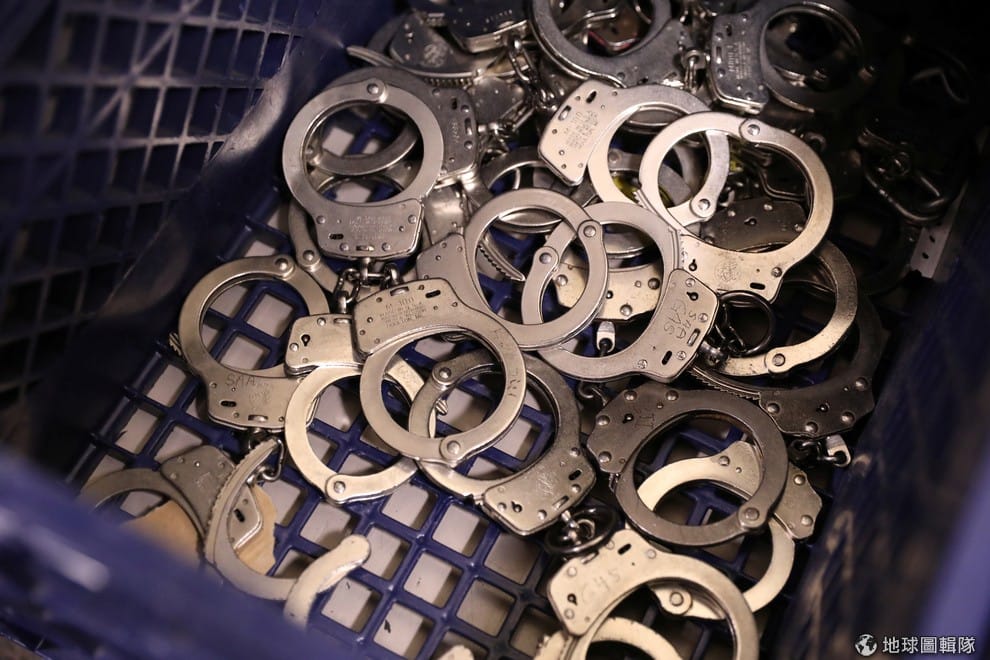 在加州的移民與海關執法部門內,一個籃子裝了滿滿的手銬,準備在抓逃犯時派上用場。