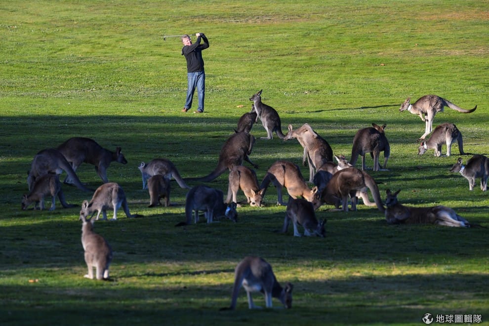 一名住在首都坎培拉(Canberra)的民眾在打高爾夫球時,發現球場上來了一群袋鼠,逗趣的模樣讓攝影師趕緊按下快門。