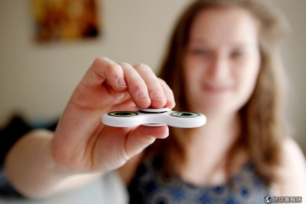 一名女孩對著鏡頭把玩手中的「指尖陀螺」(spinner)。最近,指尖陀螺開始在全球流行起來,這是一種三葉形的小玩具,使用者只要用食指和拇指按住中央的控制鈕,指尖陀螺的三片扇葉就會開始高速旋轉,給人一種難得的紓壓感。