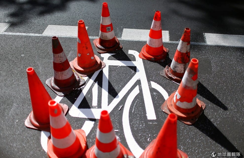 一座座三角錐擺在剛漆好的單車標誌旁,希望柏林的用路人可以多多注意,不要在油漆還沒乾時碰到標誌。