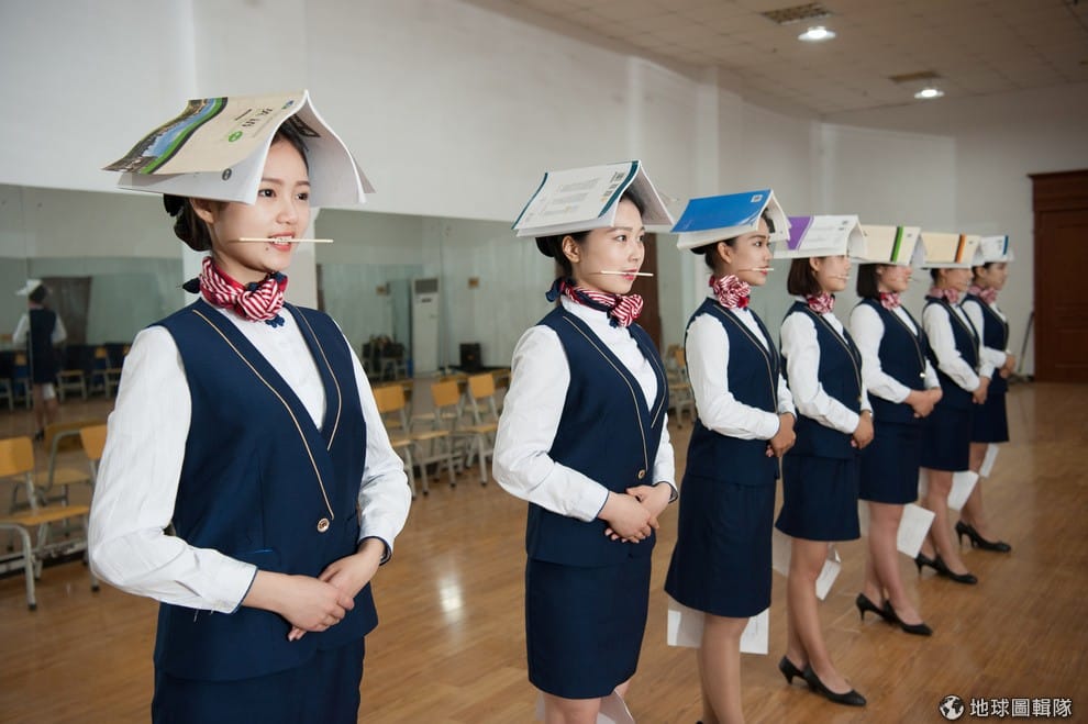 在河北省石家莊市的一所空服員訓練學校,學生頭上頂著書、嘴裡含著筷子、膝蓋間夾了紙來訓練自己的美姿美儀。